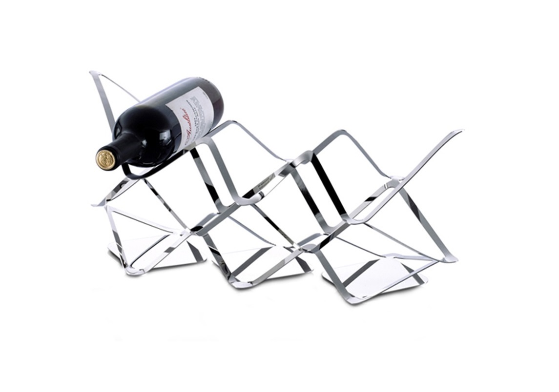 Stojan na víno z leštenej nerezovej ocele, praktický a elegantný doplnok do domácnosti.