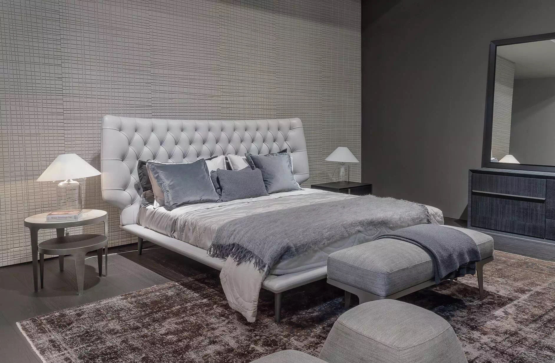 Moderná manželská posteľ 15 v nestárnucom prešívanom dizajne chesterfield a na vysokých elegantných nohách.
