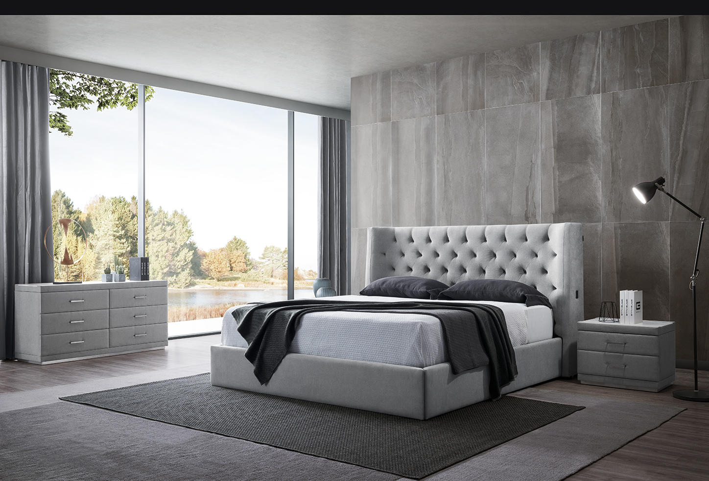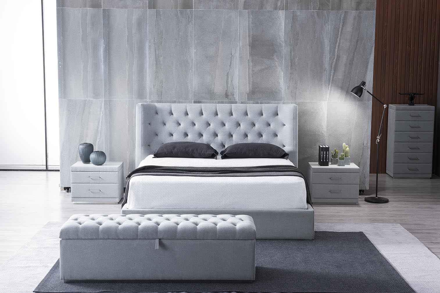 Moderná manželská posteľ 01 v nestárnucom prešívanom dizajne chesterfield.