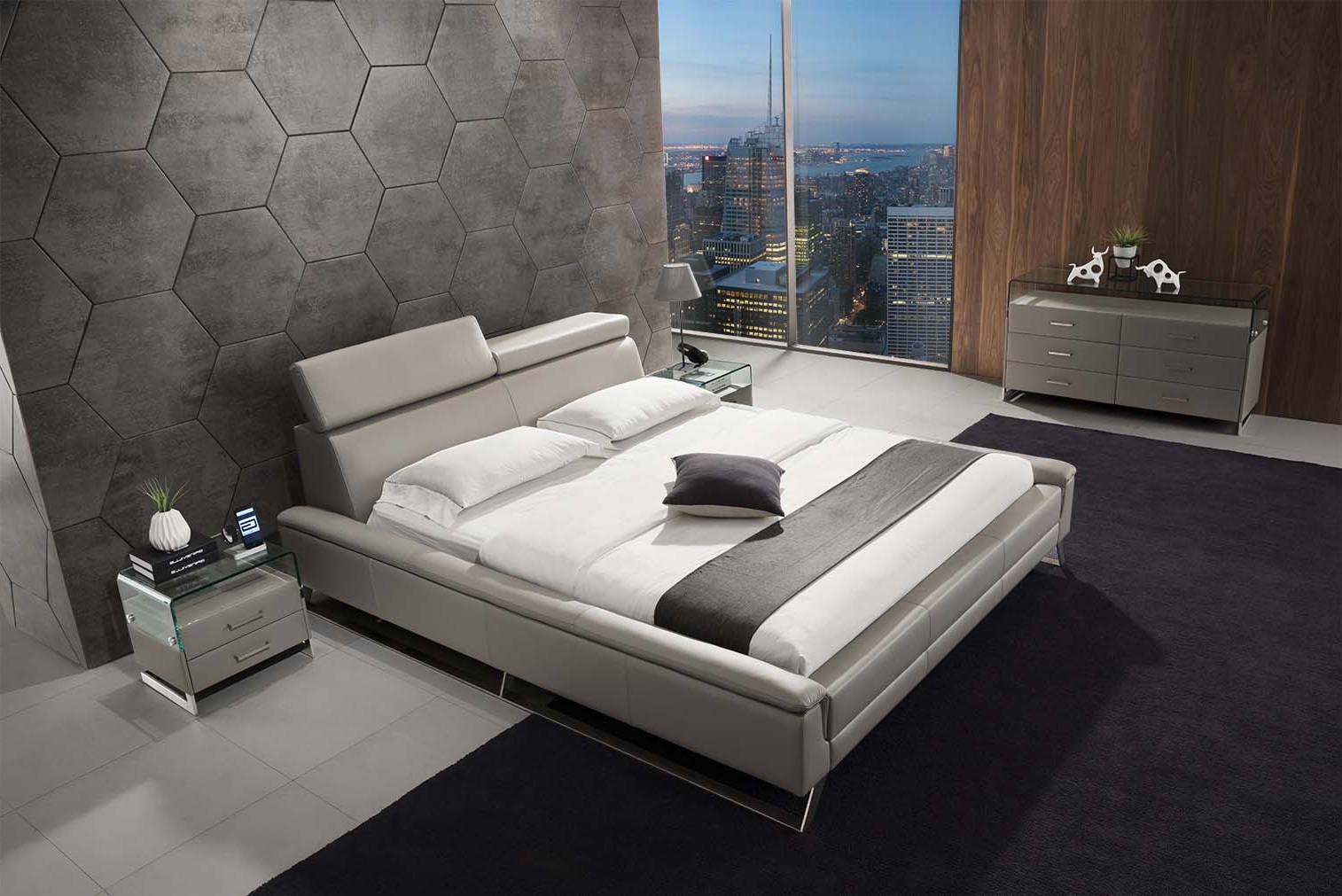 Moderná kožená manželská posteľ 27 so sklopnými záhlavnými opierkami.