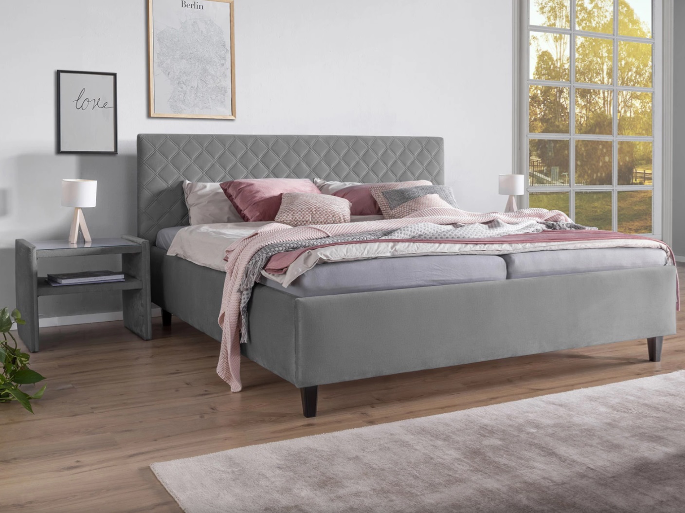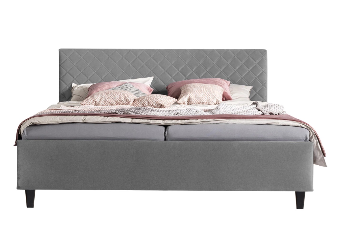 Manželská posteľ ALEJANDRO v modernom minimalistickom dizajne, s prešívaným polstrovaným čelom o výške 106 cm. Vrátane odolného roštu.