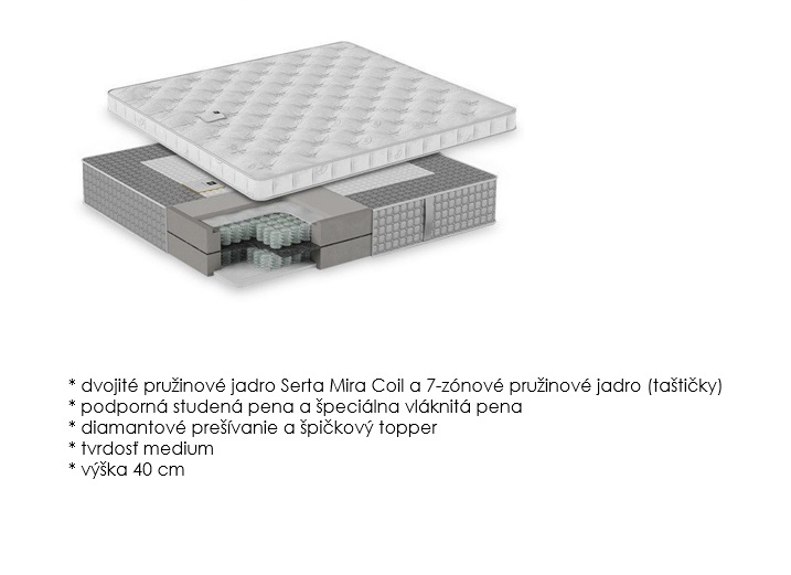 Luxusná manželská posteľ prestížnej značky SERTA. Postele tejto značky sú dokonalou voľbou ak hľadáte spojenie exkluzívneho dizajnu a komfortu. Každý model zahŕňa aj prémiový matrac, kt. je navrhnutý tak, aby Vašej chrbtici doprial dokonalú oporu a oddych - hmotnosť tela je rovnomerne rozložená na ploche matraca. Tieto postele sú už desaťročia výberom popredných svetových hotelov ako Hilton, Marriot, Crown Plaza a i.