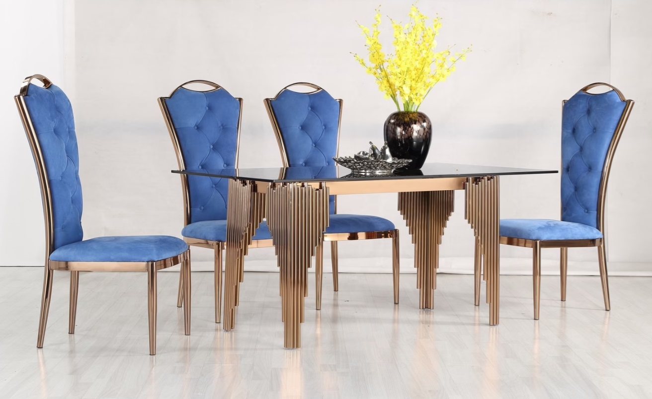 Zlatý a strieborný jedálenský stôl GLAMOUR s čiernym, čírym, mliečnym alebo dymovým sklom. Nadčasový a industriálny dizajn jedálenského stola. Stôl vhodný do moderného, ale aj rustikálneho interiéru. Stane sa z neho klenot každej kuchyne.