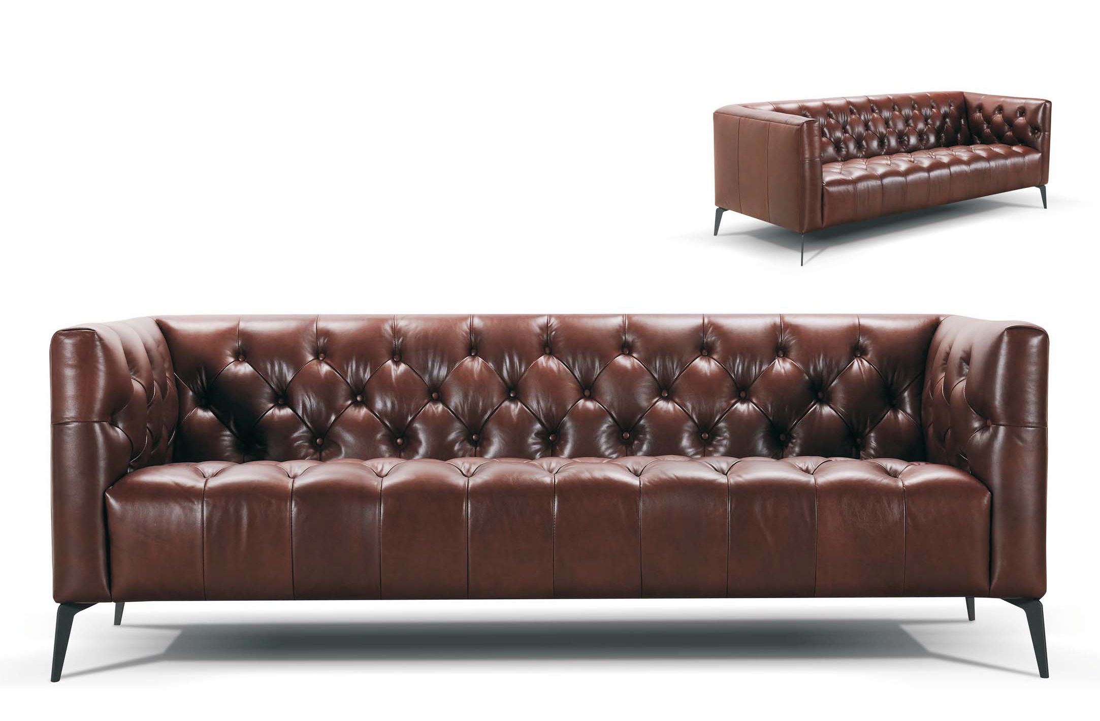Kožená sedacia súprava ANCONA v chesterfield dizajne patrí medzi luxusné a nestarnúce kúsky. Vhodná do rustikálneho, ale aj moderného interiéru, obývačky, pracovne, zimnej záhrady alebo kancelárie. Vďaka elegantným vysokým kovovým nohám pôsobí veľmi vzdušne a moderne.