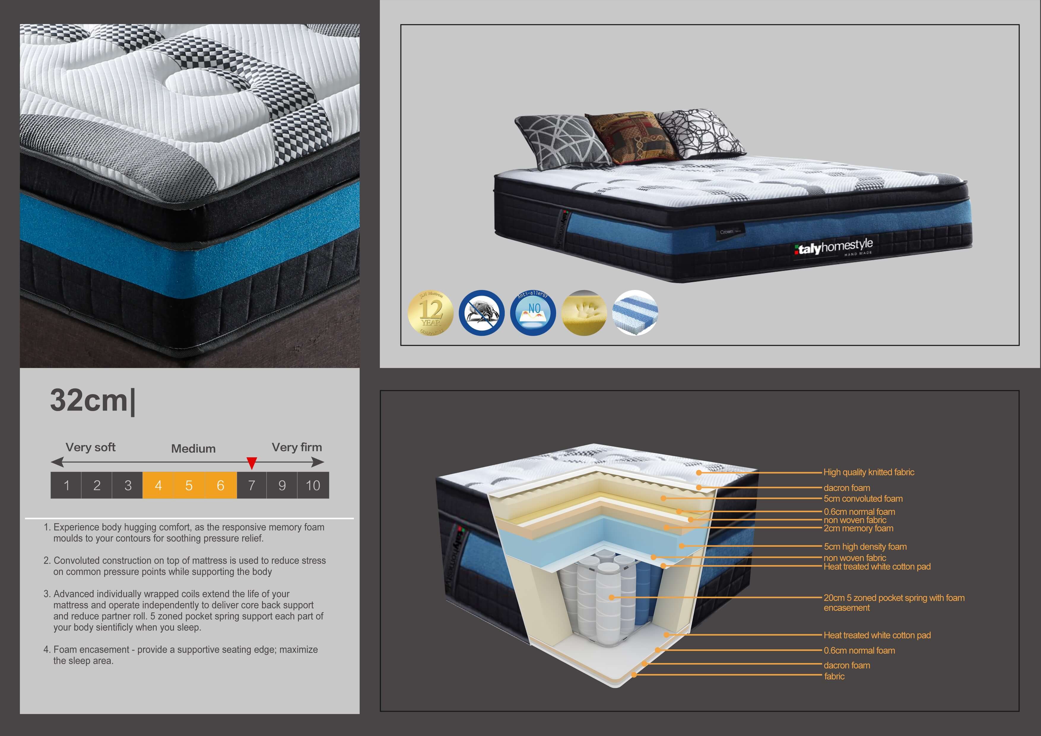 Kvalitný vyšší matrac v príjemnom dizajne sviežej farebnej kombinácie. Mäkký, na dotyk príjemný vysokokvalitný tkaný poťah je vhodný aj pre citlivú pokožku. Jadro matraca tvoria 20 cm vysoké taštičkové pružiny, navyše je použitá aj vrstva pamäťovej peny, kt. vytvára u užívateľa pocit lepšieho kopírovania tela. Zloženie matraca a 5 anatomických zón zaisťuje uvoľnenie celého tela a tým dokonalý spánok.