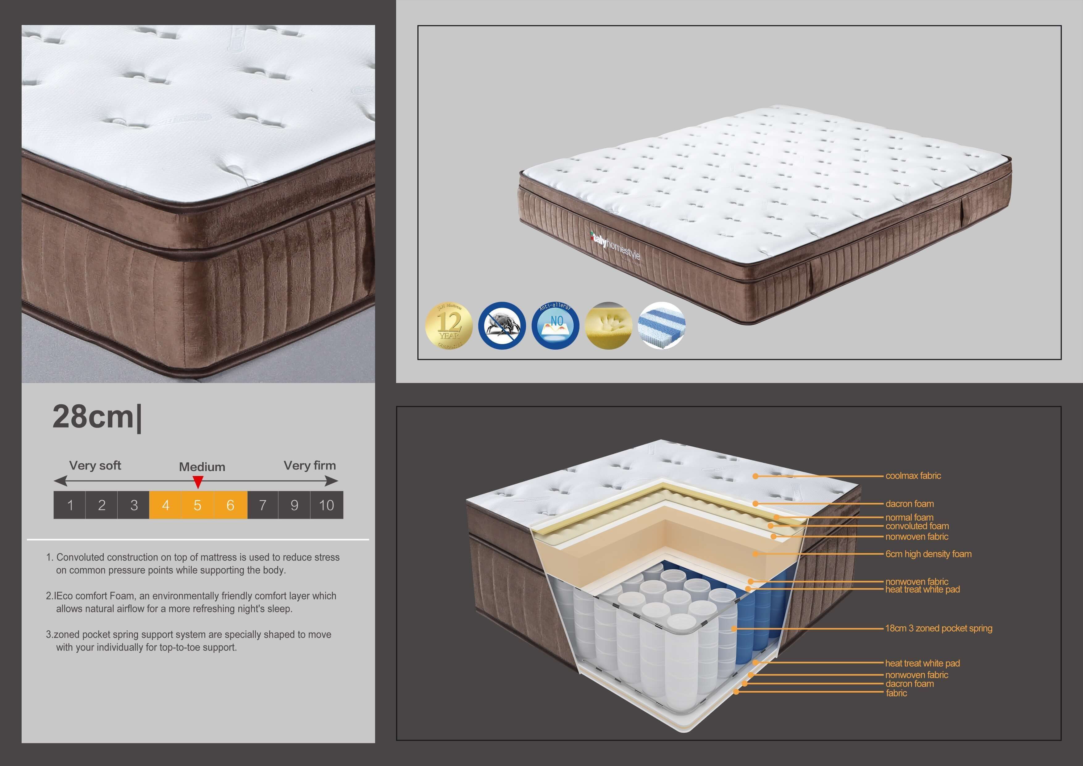 Vyšší matrac s elegantným dizajnom a vrchnou poťahovou látkou s funkciou cool max. Jadro matracu je tvorené jedným radom 18 cm vysokých 3-zónových taštičkových pružín. Je vhodný pre ľudí, ktorí zaspávajú na matraci strednej tvrdosti, pričom kladú dôraz na komfort a dobré ortopedické vlastnosti. Častá voľba zákazníkov, kt. nekladú dôraz na vysokú tvrdosť, príp. hľadajú vhodný matrac pre staršie deti.