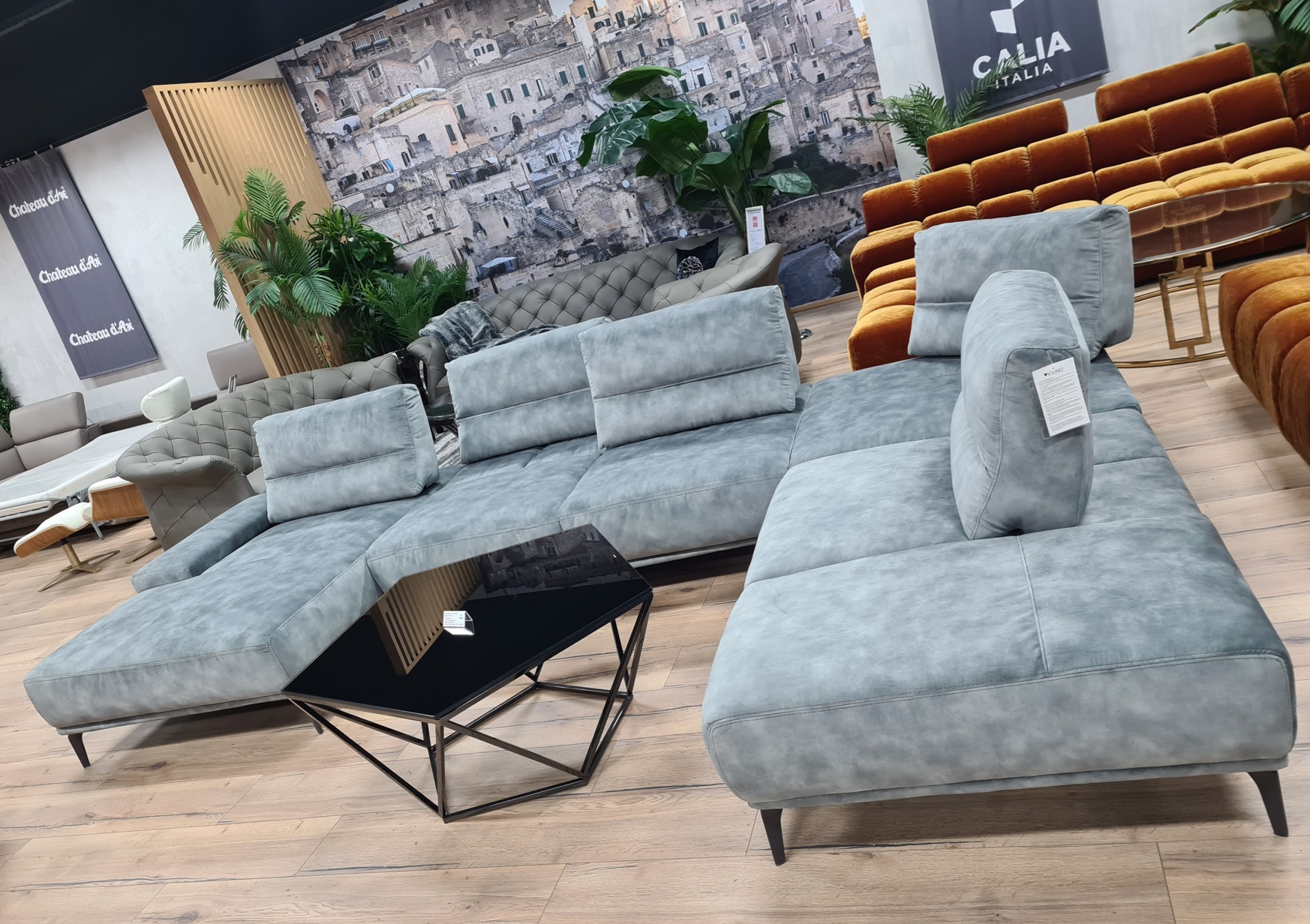 • skladom: L-kové prevedenie šedý zamat, U-čkové prevedenie dymovo-modrý zamat a šedý zamat