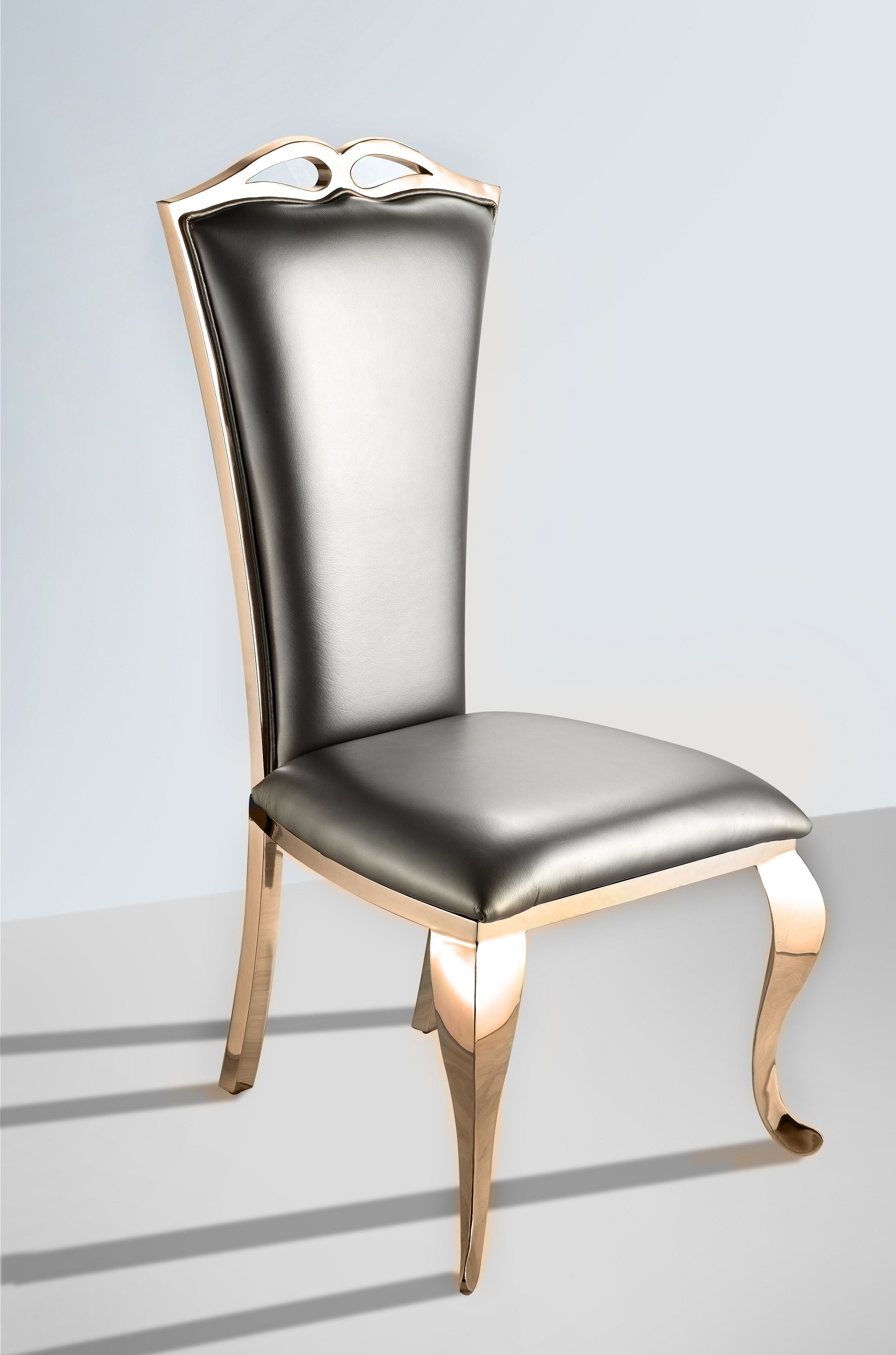 Moderná jedálenská stolička čalúnená látkou, kožou prípadne PU kožou. Stoličky sú pevné, vyrobené z nereze. Pre komfort sedenia sa postará precízne čalúnenie.