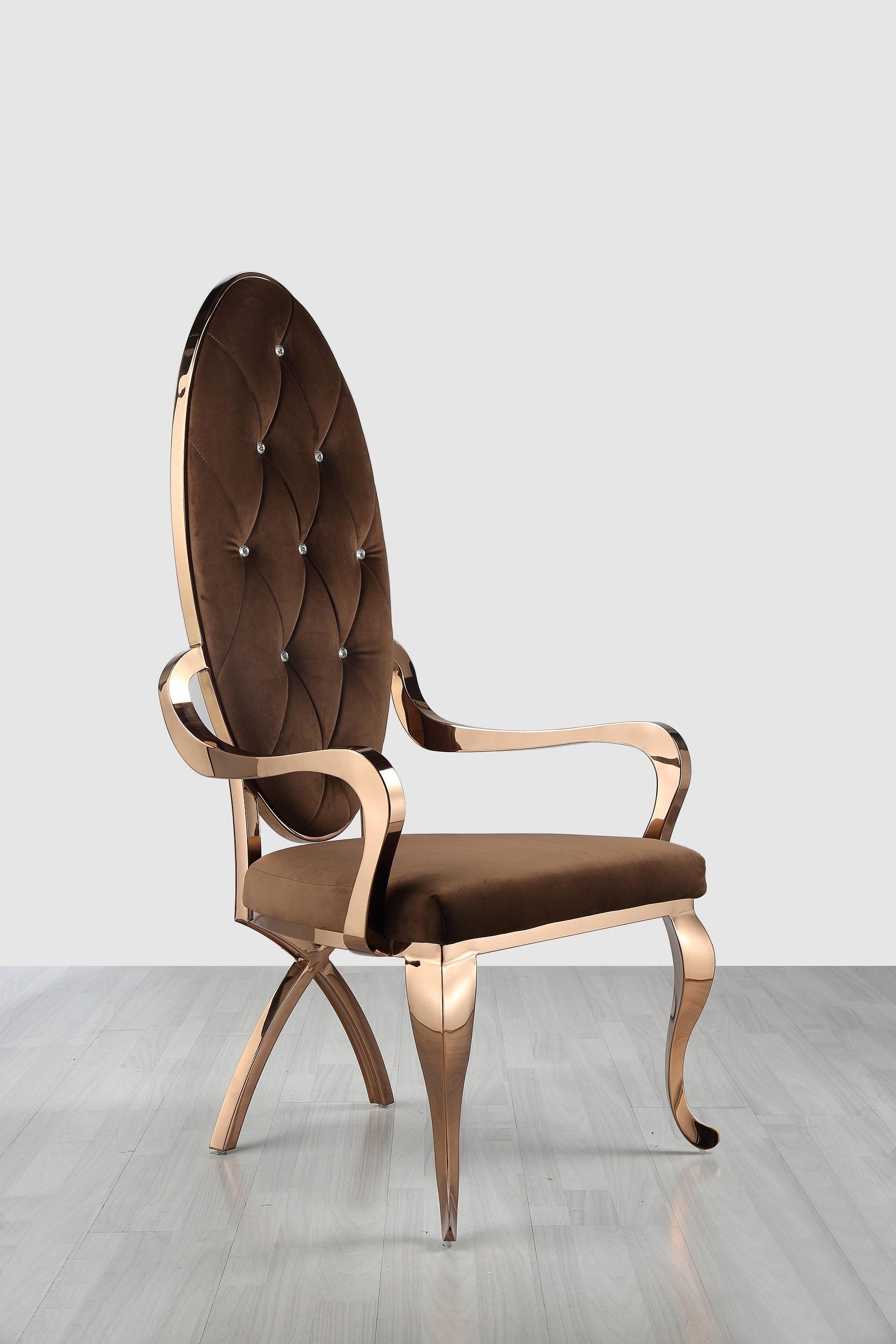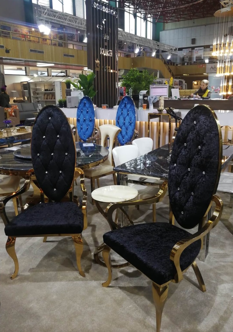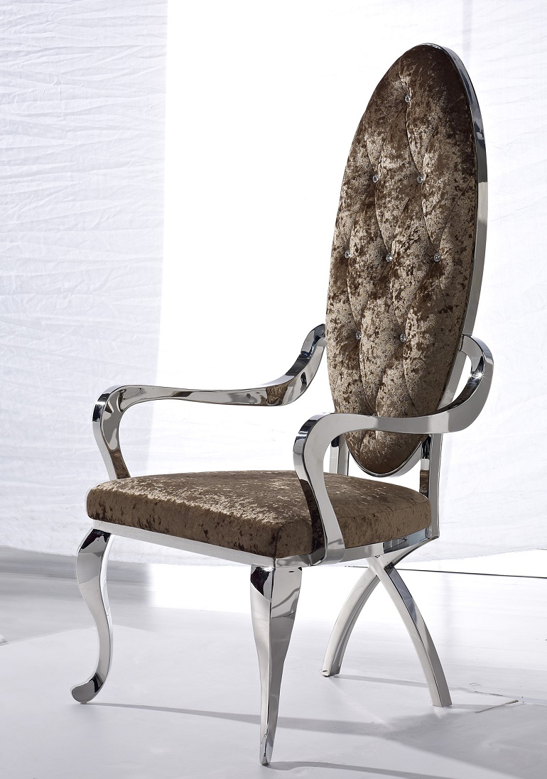 Luxusná a výrazná jedálenská stolička QUEEN čalúnená látkou, kožou prípadne PU kožou. Stoličky sú pevné, vyrobené z nereze. Pre komfort sedenia sa postará precízne čalúnenie.